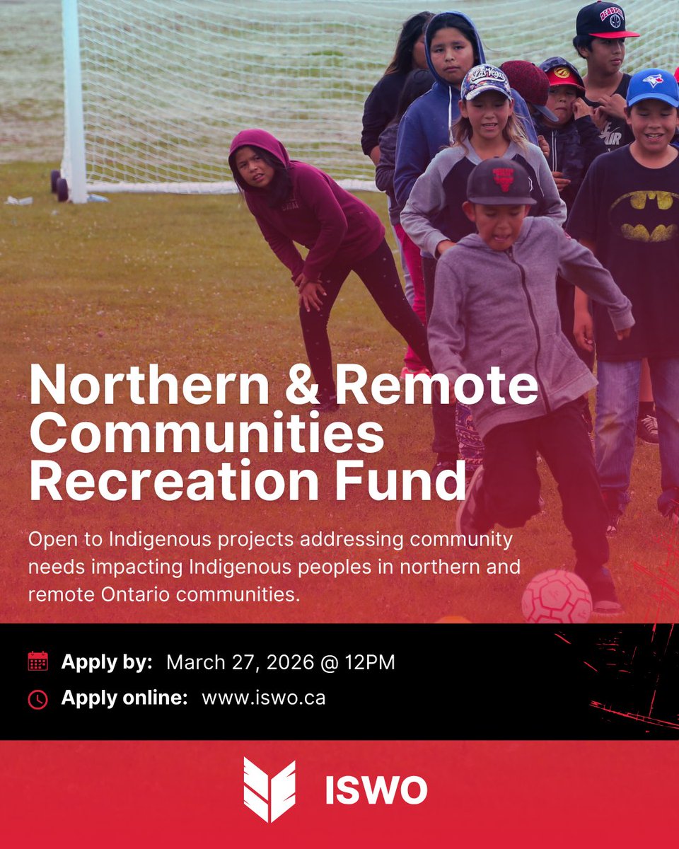 RT @ISWO_ca: The Northern & Remote Communities Recreation Fund is officially open for 2026! Apply by Fri Mar 27 at 12PM. Open to projects…