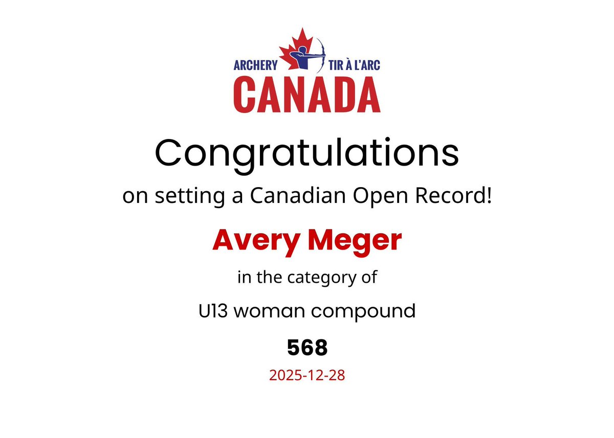 RT @ArcheryCanada: New Canadian open record 👏 U13 woman compound: Avery Meger with a score of 568. 2025-12-28 Congratulations! Nouveau re…