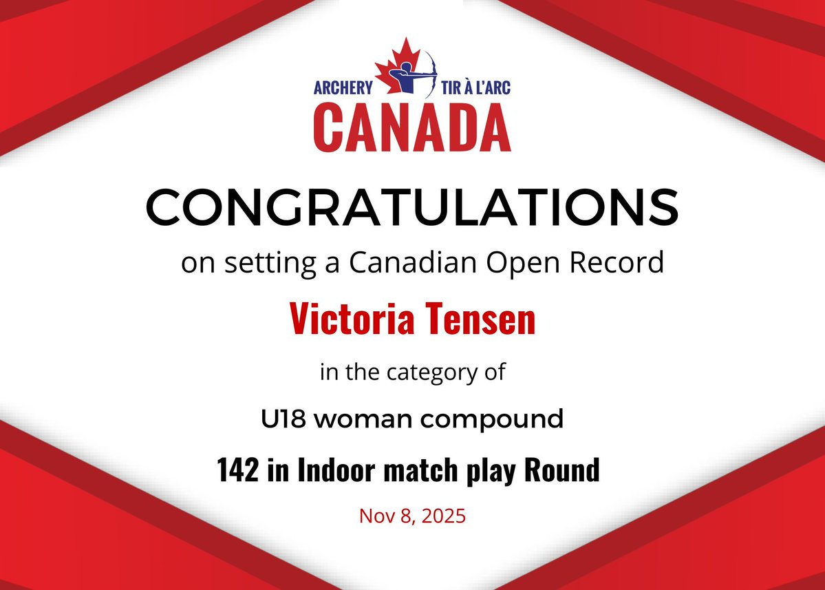 RT @ArcheryCanada: CONGRATULATIONS to Victoria Tensen on setting a Canadian Open Record in U18 woman compound with a score of 142 in Indoo…