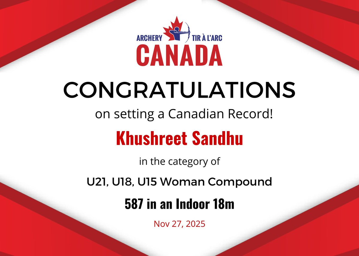RT @ArcheryCanada: CONGRATULATIONS to Khushreet Sandhu on setting a Canadian Record in the categories of U21, U18, U15 Woman Compound 587 (…