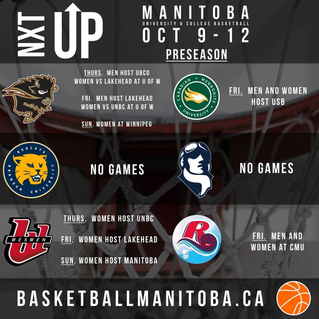 RT @basketballmb: NXT UP: MANITOBA UNIVERSITY AND COLLEGE BASKETBALL - OCT 9-12 For game details, tickets and results, follow… @bubobcats…