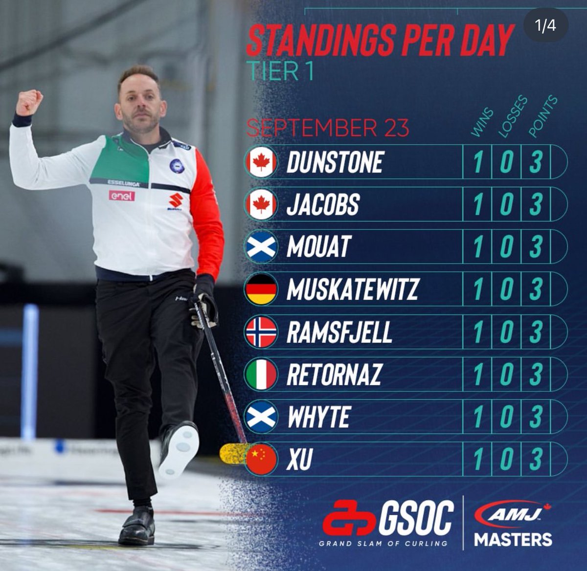 RT @Devin_Heroux: Good morning sports fans Day 2 at the @grandslamcurl begins. Tier 1 is underway. Here’s a look at the standings. Tier 2…