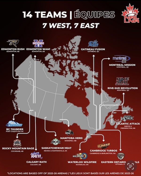 The League boasts 14 teams with 7 teams representing both the eastern and western regions of Canada. This year marks both the launch of the NRL's 21st season and the inaugural start of the Rocky Mountain Rage, a team based out of Cochrane, Alberta.