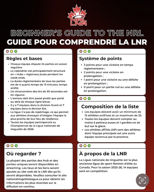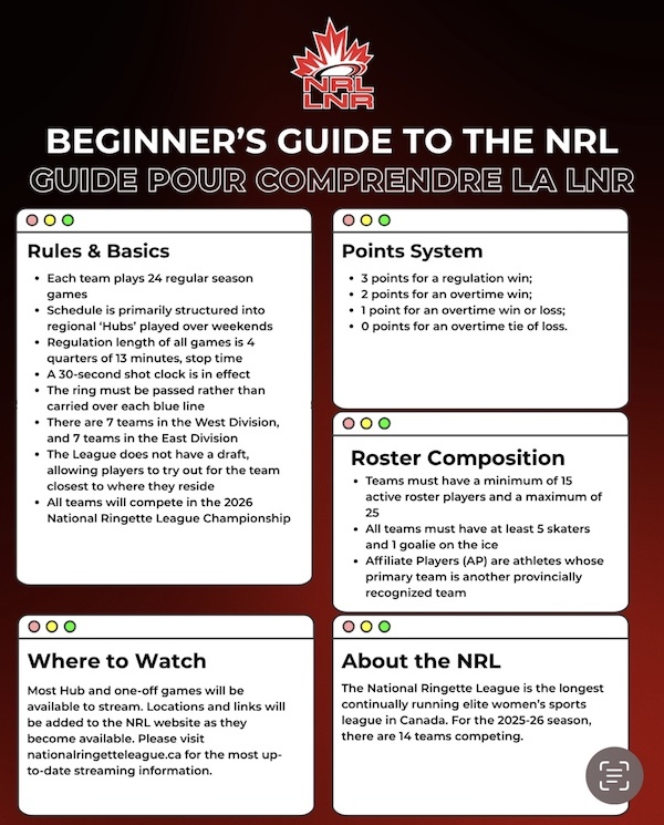 Whether you're a long-time NRL follower or brand new fan to the game of ringette, find lots of links and lists below to help you get up to speed on the NRL, Hub Game Schedules, and each of the League's 14 participating teams. Make the 2025-2026 season the year you #WatchHerPlay and #CheerHerOn.