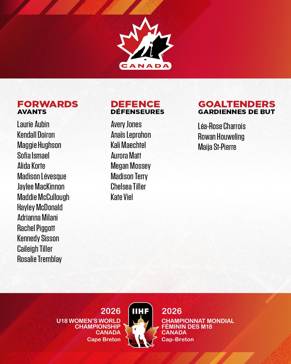 RT @HockeyCanada: Introducing the 2⃣5⃣ players who will wear the 🍁 at #U18WomensWorlds! Voici les 2⃣5⃣ joueuses qui arboreront la 🍁 au #Mo…
