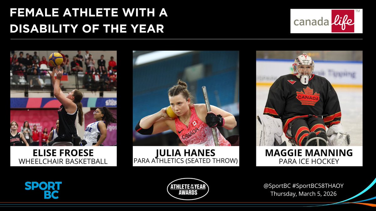 RT @SportBC: Congratulations to the Female Athlete with a Disability of the Year finalists: Elise froese, Julia Hanes, and Maggie Manning!…
