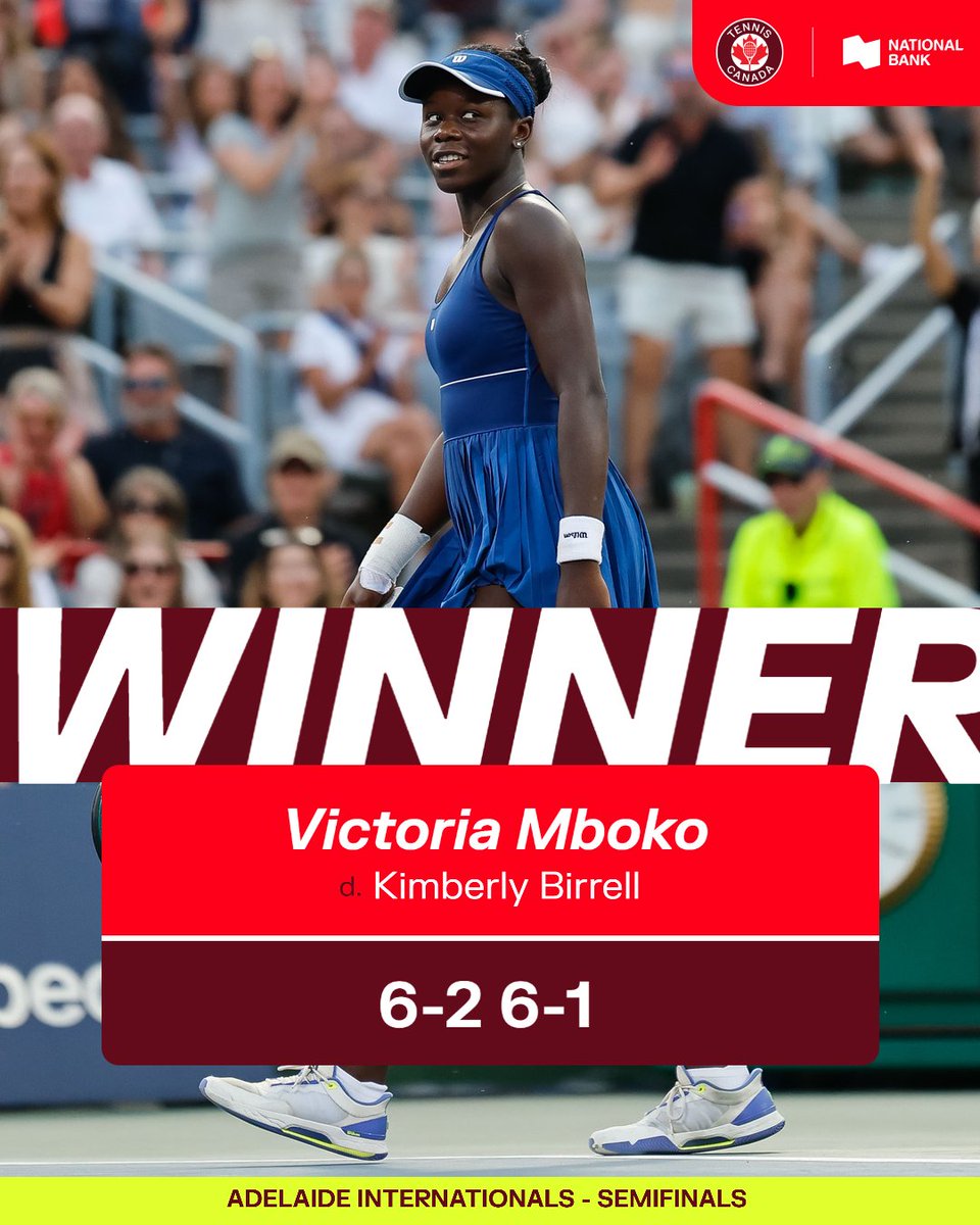 RT @TennisCanada: 1 MORE WIN IS ALL IT TAKES 😍 Victoria Mboko 🇨🇦 is through to the finals of the Adelaide Internationals after taking down…
